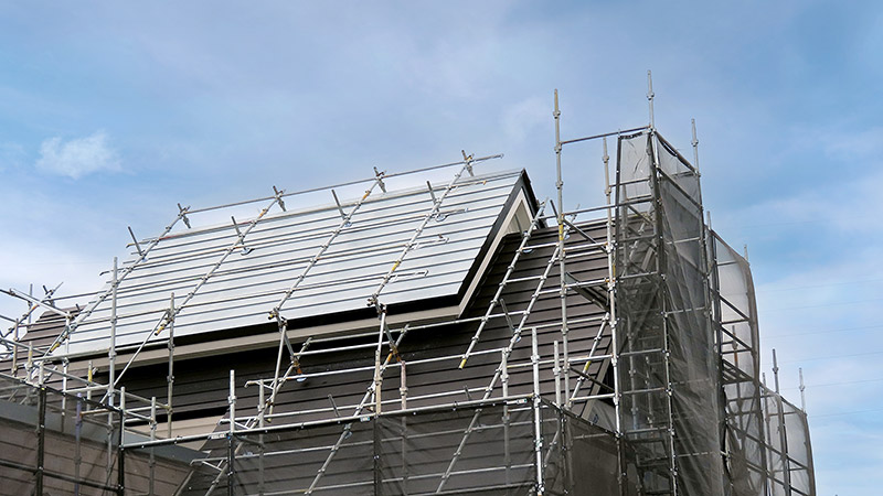 鳶工事が建物の骨組みを組み立てた後に、足場工事が足場を組み立てて作業員の安全を確保し、建物の外壁工事や屋根工事、塗装工事などが行われます。